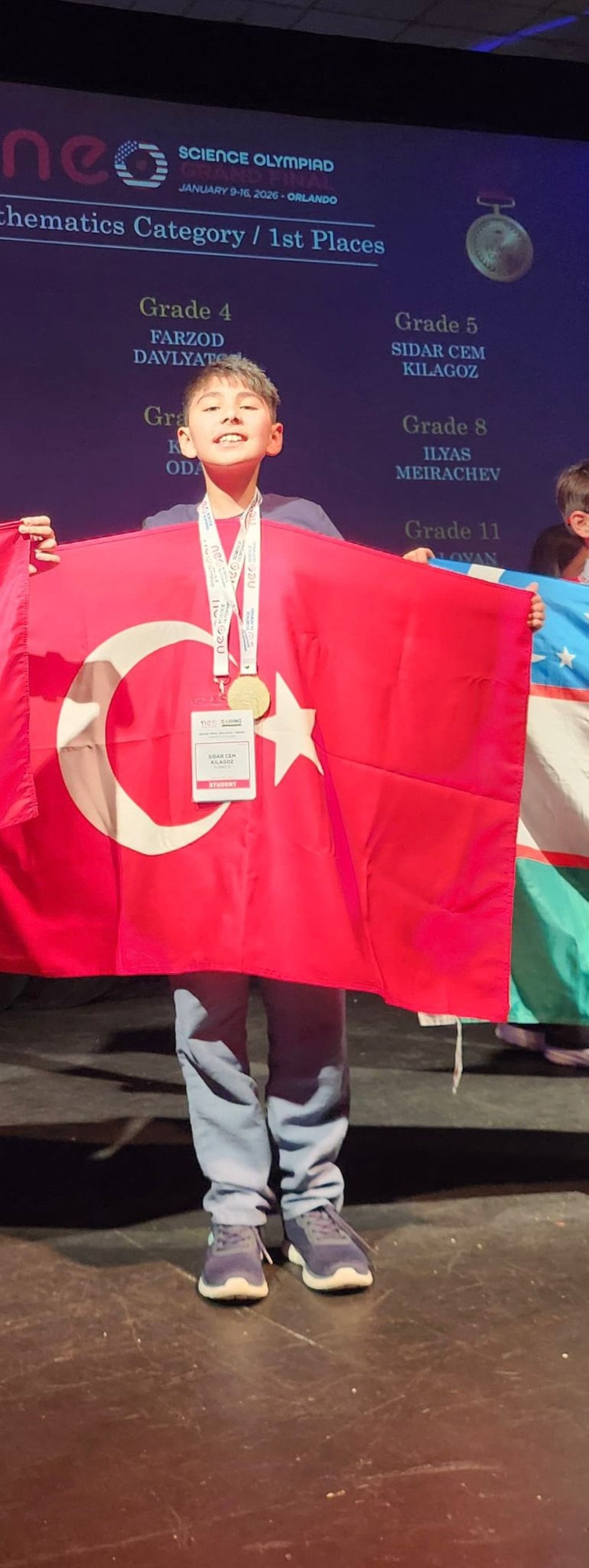 Amerika’nın Orlando kentinde düzenlenen Uluslararası Neo Science Olimpiyatları’na Türkiye adına katılan, İstanbul’da yaşayan 5’inci sınıf öğrencisi 11 yaşındaki Sidar Cem Kılagöz, matematik alanında kendi yaş kategorisinde dünya birincisi oldu. Aynı organizasyonda bilim dalında da altın madalya kazanan Sidar, üstün başarısıyla dikkat çekti.