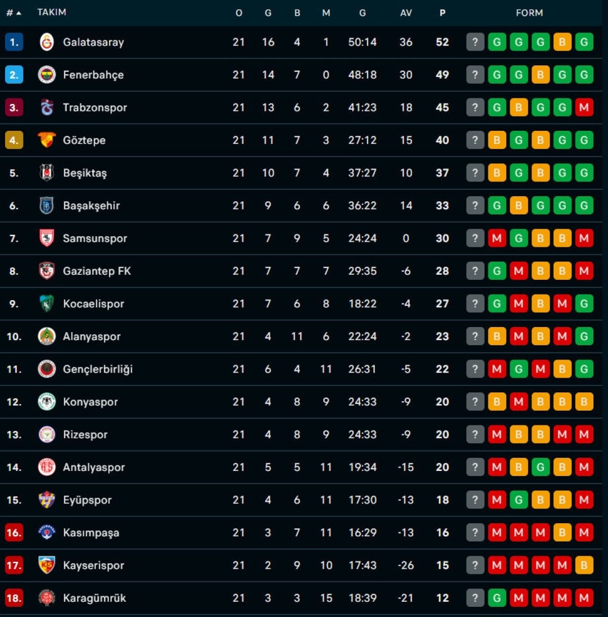 Haftaya en yakın takipçisi Fenerbahçe’nin 3 puan önünde giren Galatasaray 21. hafta mücadelelerinin ardından liderlik koltuğunu korudu.