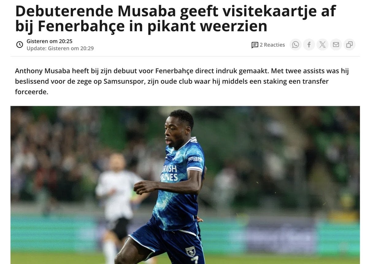 Hollanda’nın önde gelen futbol platformlarından Vi.nl, Musaba’nın ilk maçındaki etkisini vurguladı. Haberde, “Yeni transfer Anthony Musaba, Fenerbahçe’de heyecan dolu ilk maçında unutulmaz bir izlenim bıraktı” ifadeleri kullanıldı.