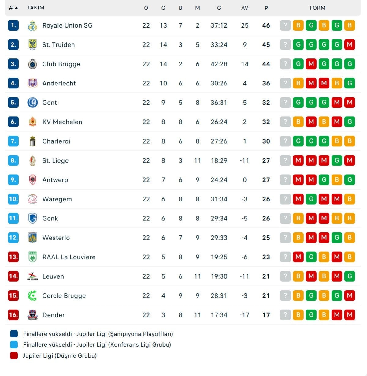 BELÇİKA LİGİ’NDE PUAN DURUMU