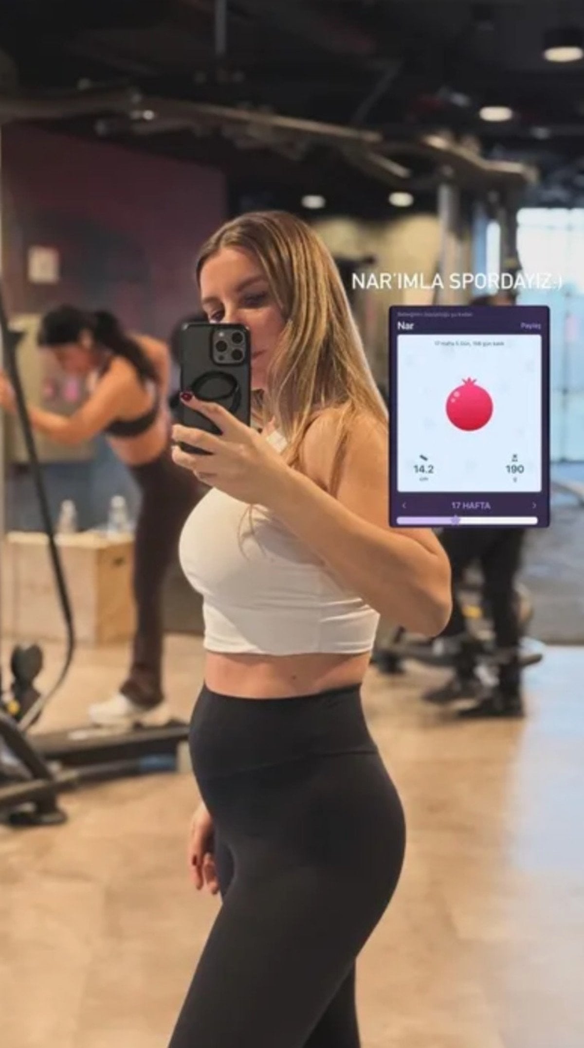 Hamileliğinin 17. haftasında olan Erol, bebeğinin boyutunu bir nar simgesiyle eşleştiren görüntüyü paylaşımına ekleyerek “Nar’ımla spordayız” notunu düştü.