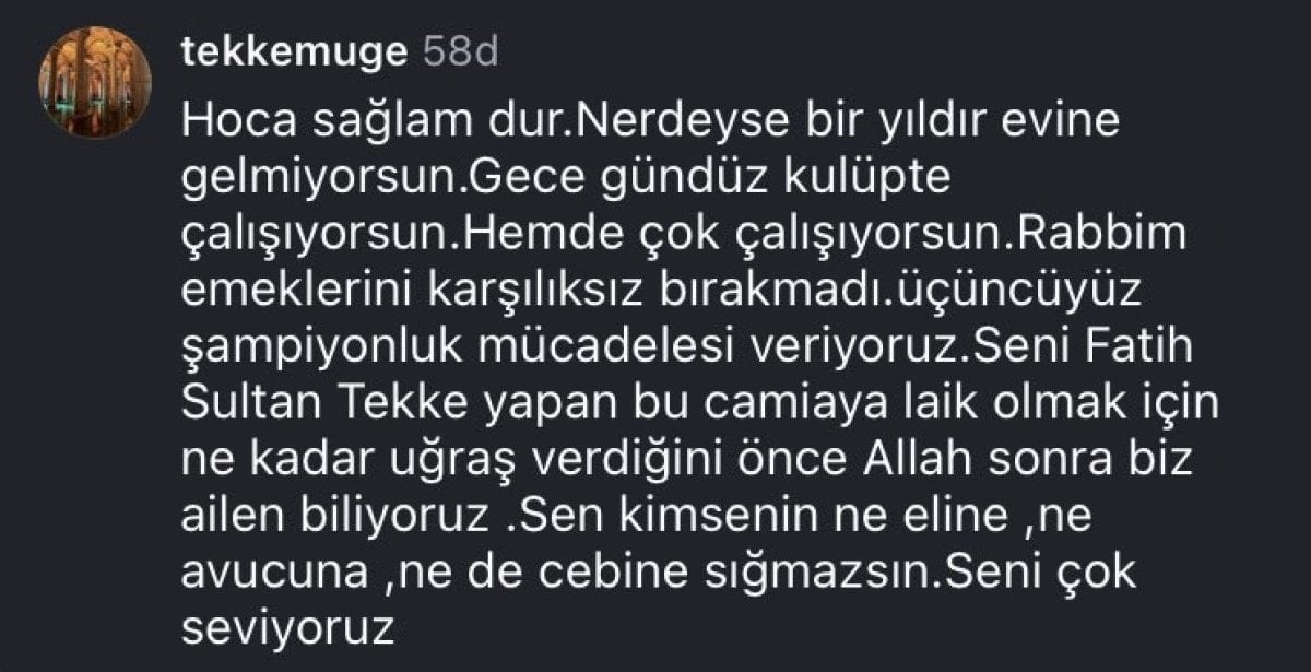 “Hoca sağlam dur. Neredeyse bir yıldır eve gelmiyorsun. Gece gündüz kulüpte çalışıyorsun. Hem de çok çalışıyorsun. Rabbim emeklerini karşılıksız bırakmadı. Üçüncüyüz, şampiyonluk mücadelesi veriyoruz. Seni Fatih Sultan Tekke yapan bu camiaya laik olmak için ne kadar uğraş verdiğini önce Allah sonra biz ailen biliyoruz. Sen kimsenin ne eline, ne avucuna, ne de cebine sığmazsın. Seni çok seviyoruz.”