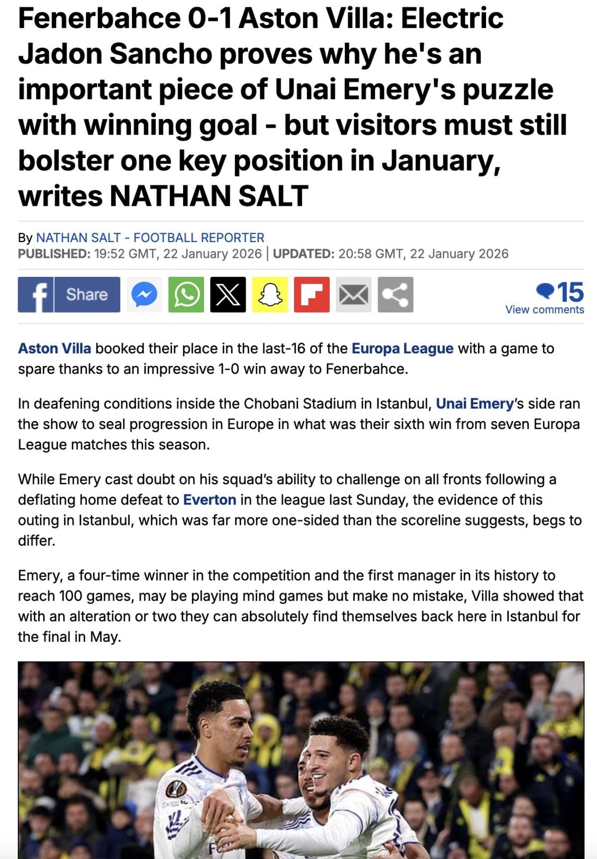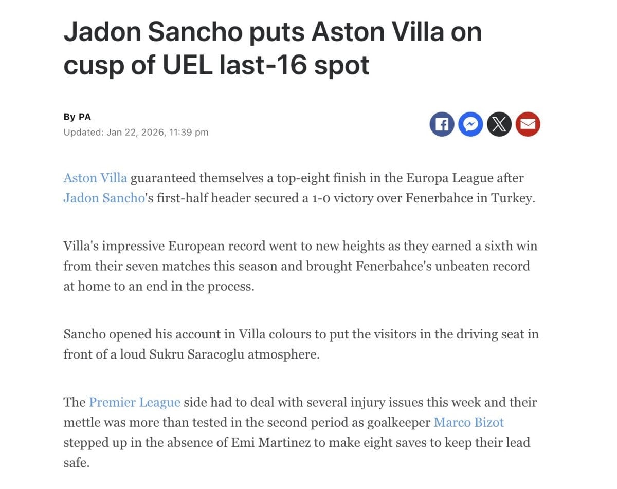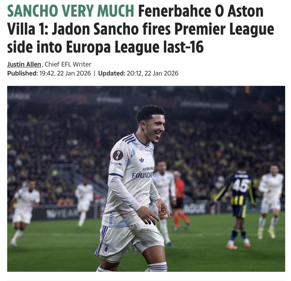 “Sancho Türkiye’de etkileyici bir performans sergiledi. Jadon Sancho, Matty Cash’in seken ortasına yetişerek topu Fenerbahçe kalecisi Ederson’un üzerinden kafa vuruşuyla ağlara gönderdi ve Aston Villa formasıyla ilk golünü kaydetti. İngiliz oyuncu, Morgan Rogers ile birlikte Türkiye’deki düşmanca atmosferde Villa’nın en yaratıcı oyuncusu oldu.”