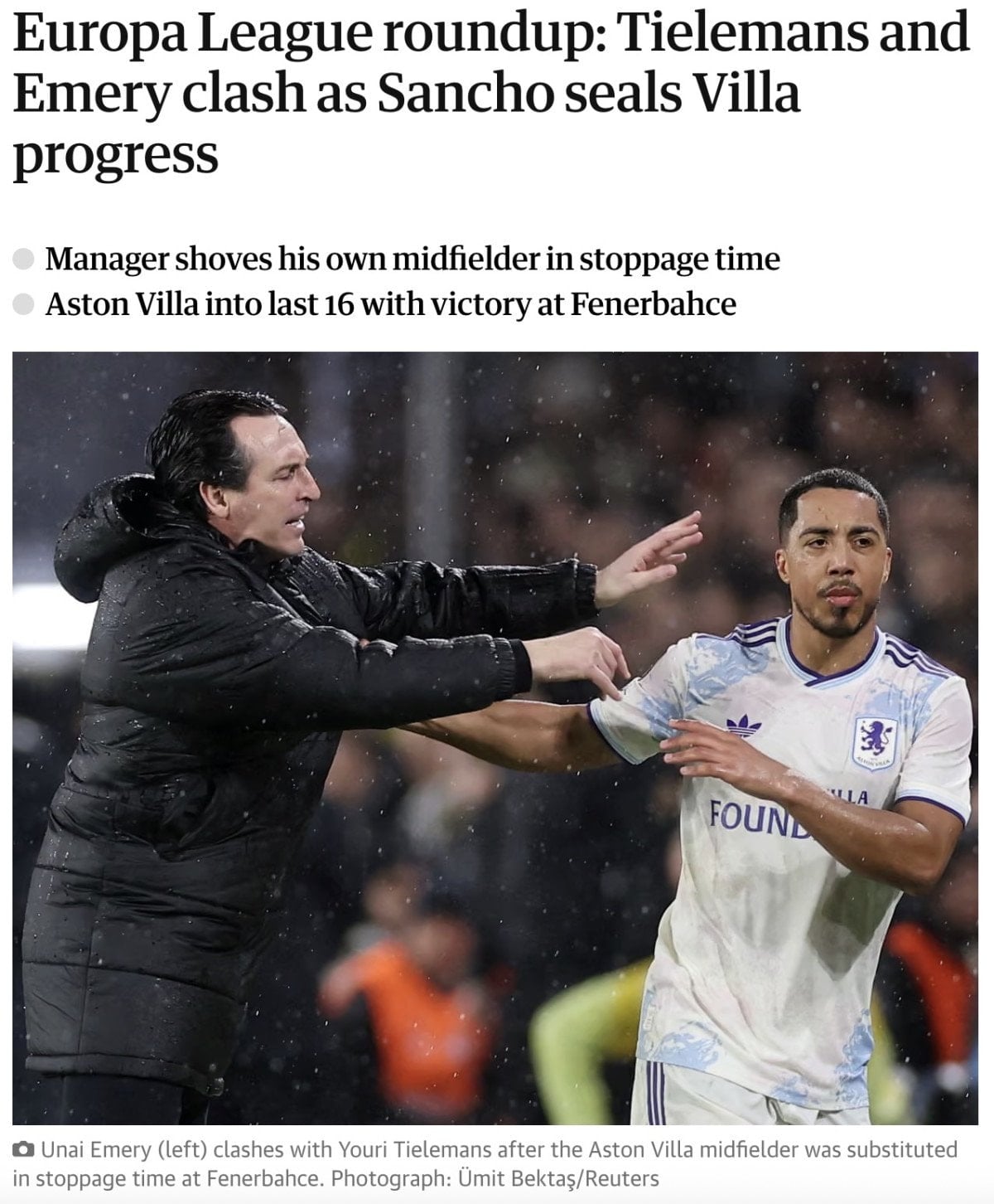 “Tielemans ve Emery tartıştı, Sancho Villa’ya turu getirdi. Aston Villa, Jadon Sancho’nun bu sezon attığı ilk golle Fenerbahçe’yi 1-0 yenerek Avrupa Ligi’nde ilk 8’e adını yazdırdı. Ancak Villa teknik direktörü Unai Emery, uzatma dakikalarında oyundan çıkan Youri Tielemans ile saha kenarında tartışma yaşadı.”