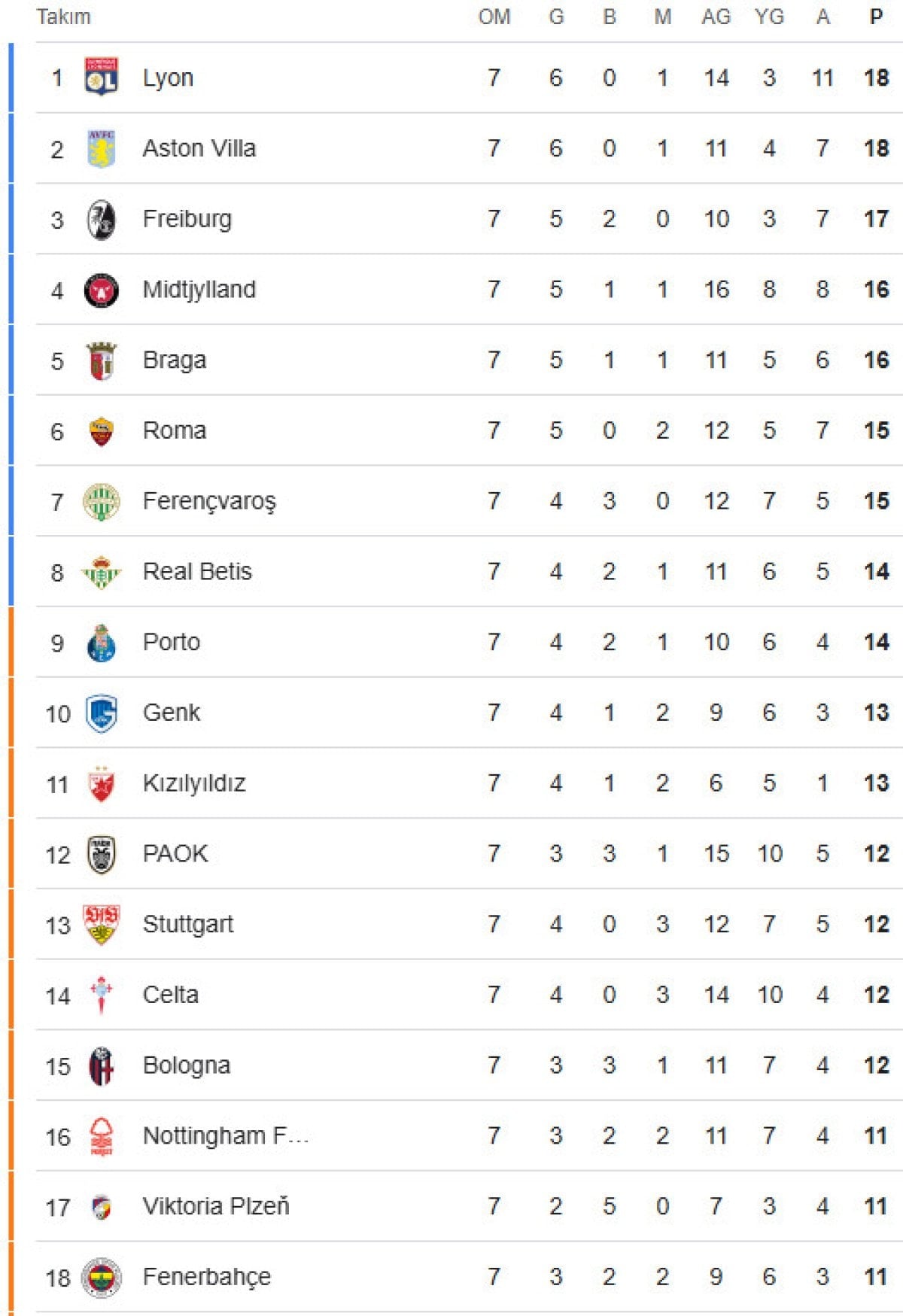 UEFA Avrupa Ligi’nin 7. haftasında Aston Villa’ya 1-0 mağlup olan Fenerbahçe’nin alınan sonuçların ardından ilk 24’e girmesi kesinleşti.