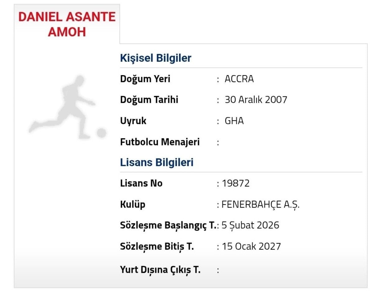 Fenerbahçe’nin 2007 doğumlu Ganalı oyuncu Daniel Asante Amoh’u kadrosuna kattığını TFF’ye bildirdiği ortaya çıktı.