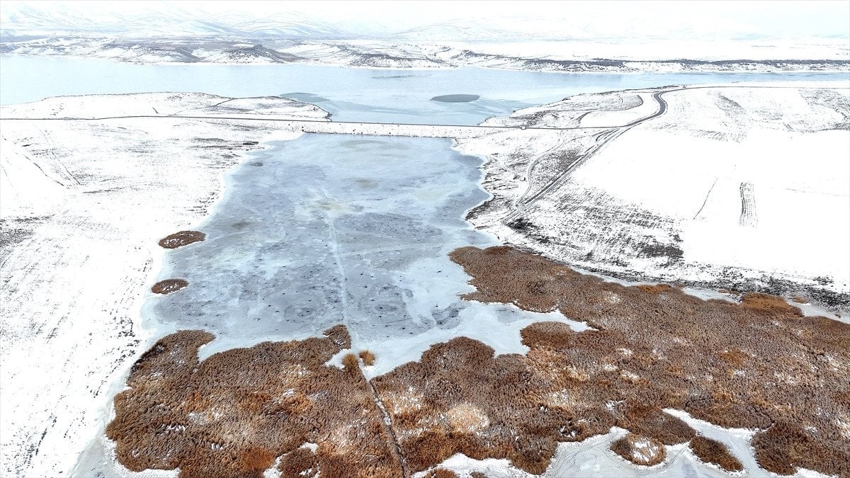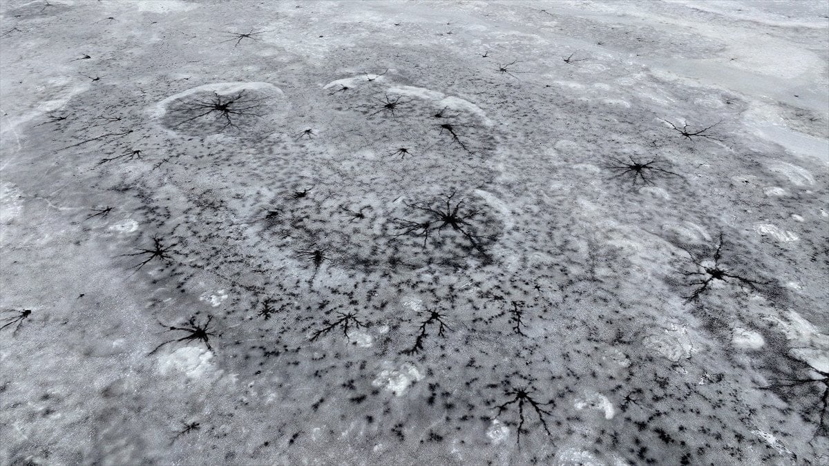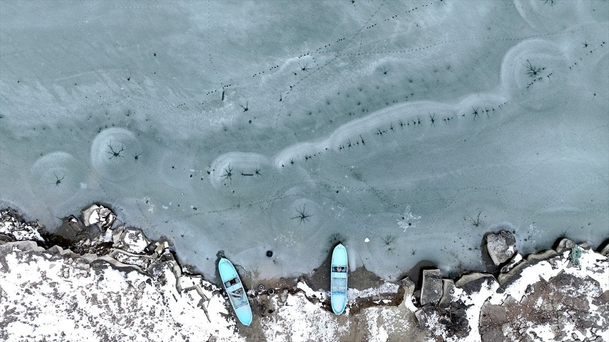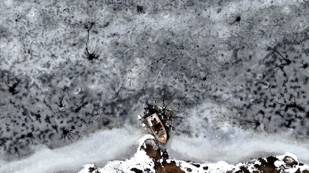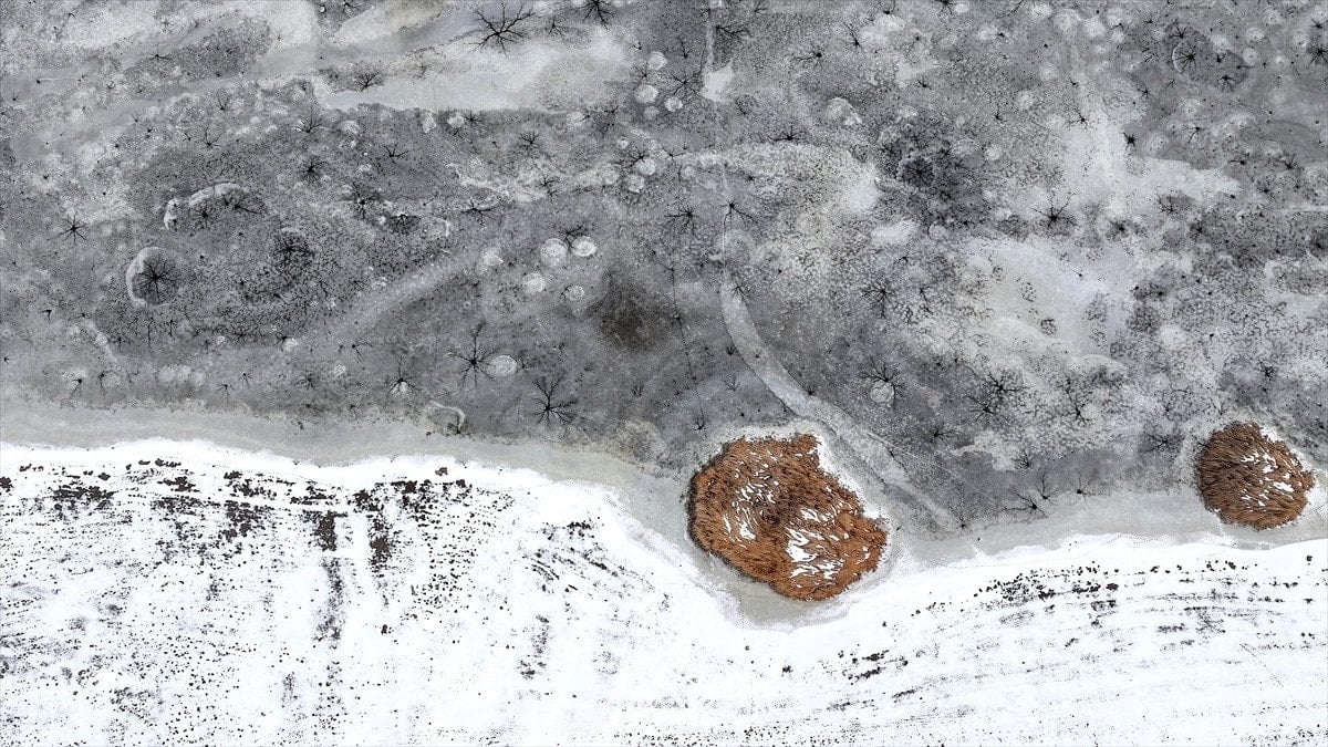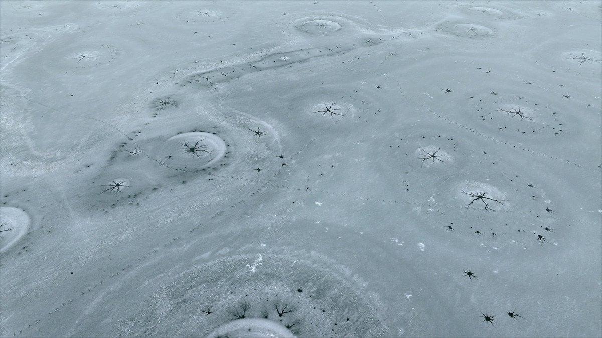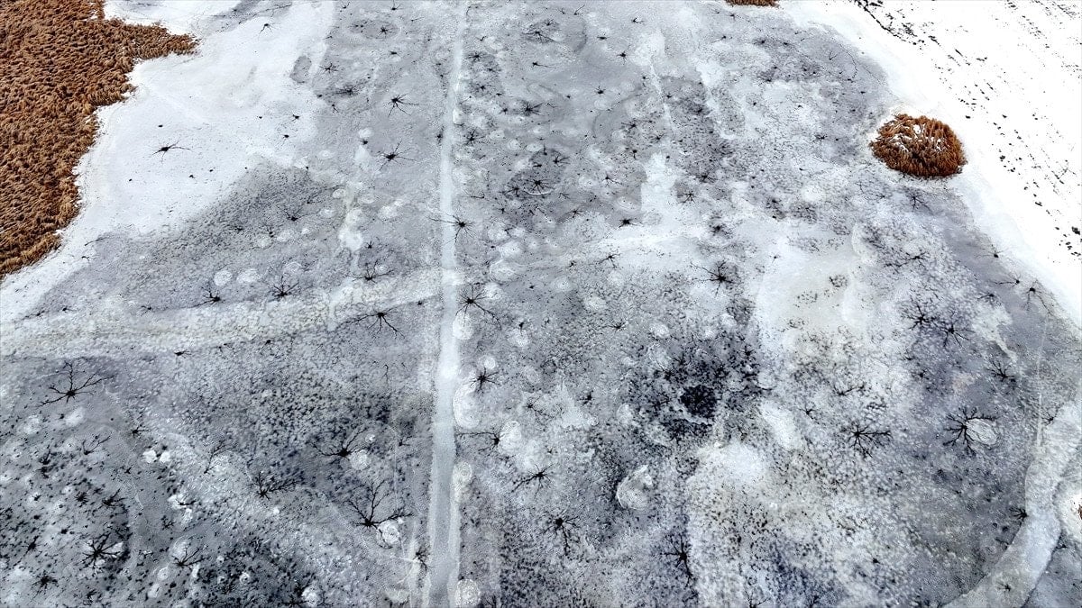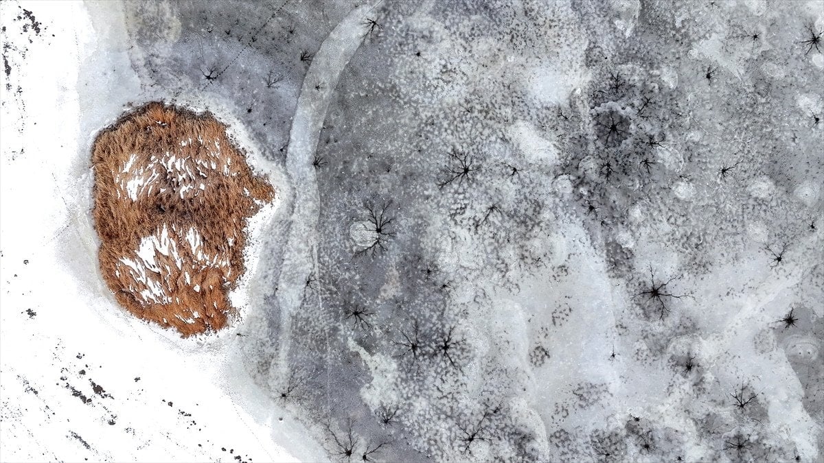 Drone’la kaydedilen görüntülerde, göl yüzeyinde halka formunda buz yapıları ve bu halkaların merkezinden çevreye doğru yayılan çatlaklar net şekilde görüldü. Beyaz ve açık mavi tonların hâkim olduğu buz tabakası, havadan bakıldığında insan gözünün iris ve göz bebeğini çağrıştıran desenler oluşturdu.