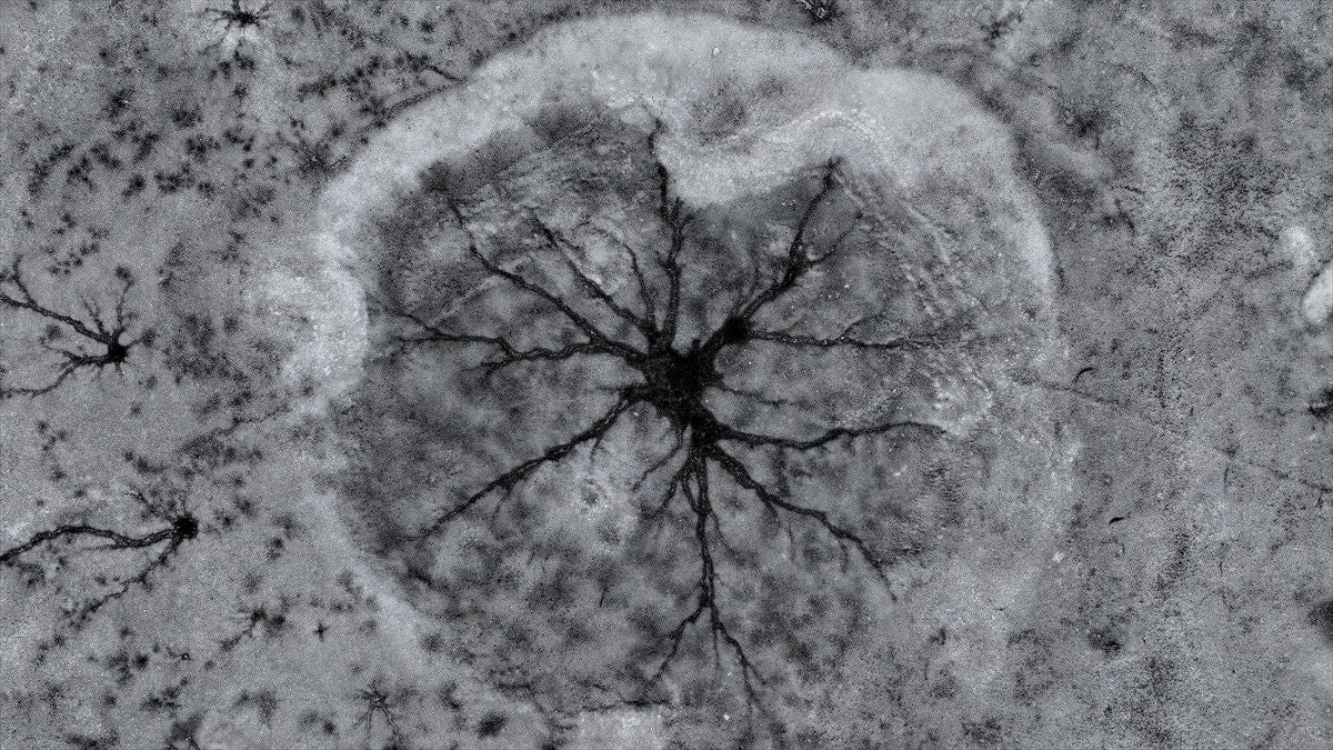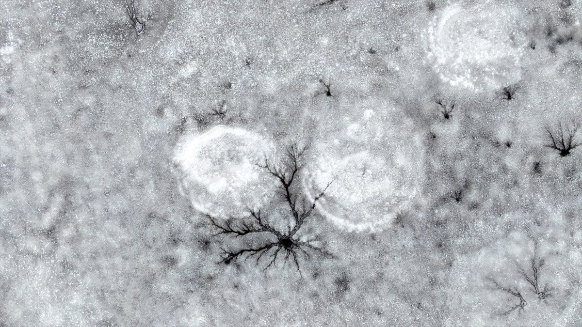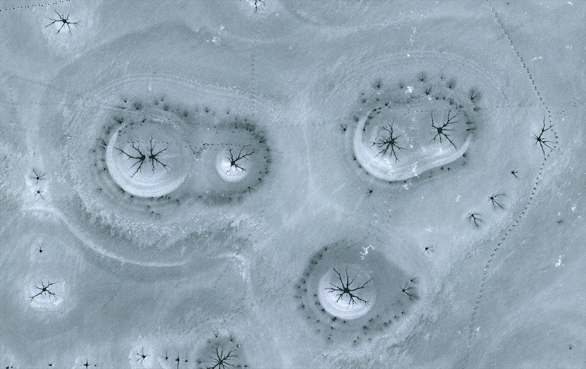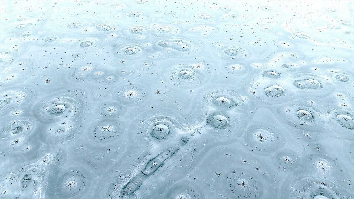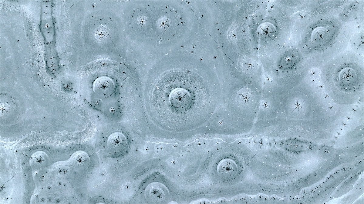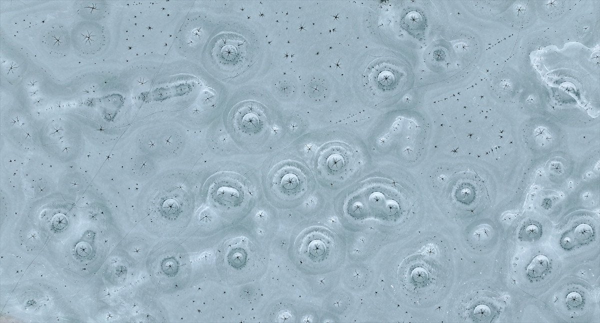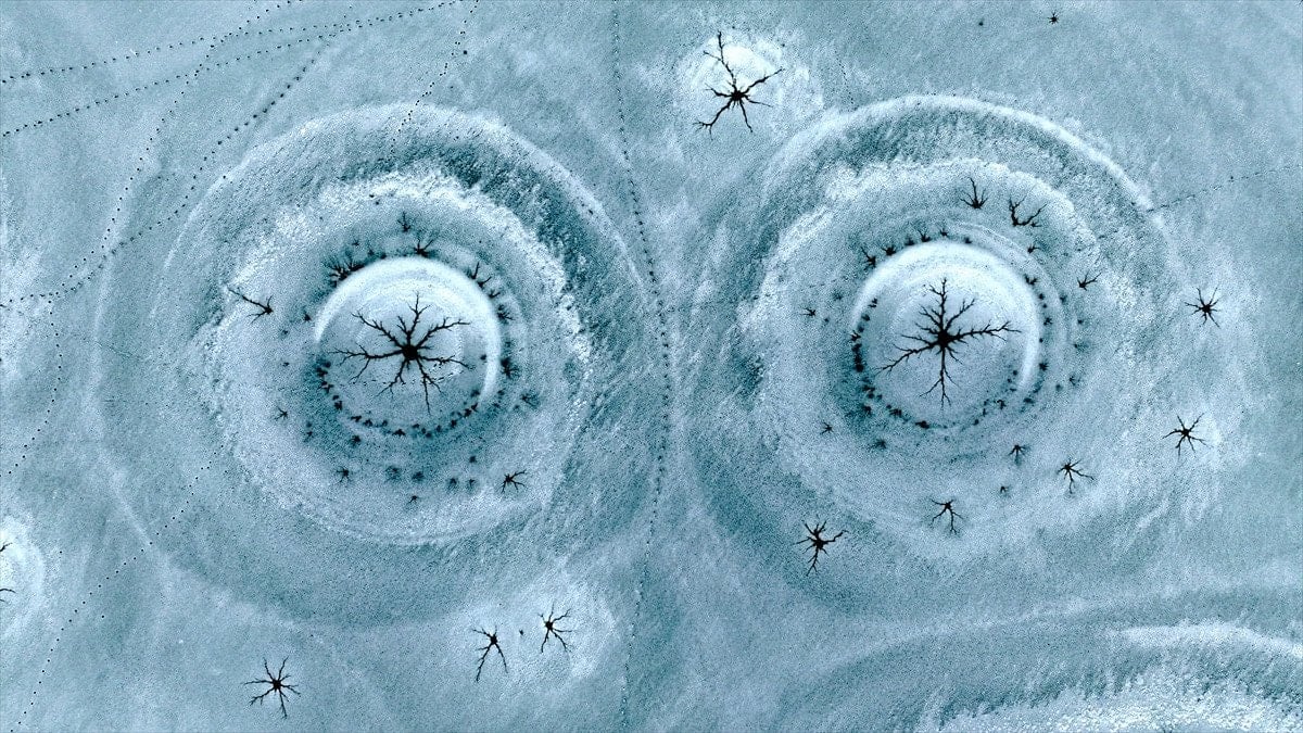 Drone’la kaydedilen görüntülerde, göl yüzeyinde halka formunda buz yapıları ve bu halkaların merkezinden çevreye doğru yayılan çatlaklar net şekilde görüldü. Beyaz ve açık mavi tonların hâkim olduğu buz tabakası, havadan bakıldığında insan gözünün iris ve göz bebeğini çağrıştıran desenler oluşturdu.