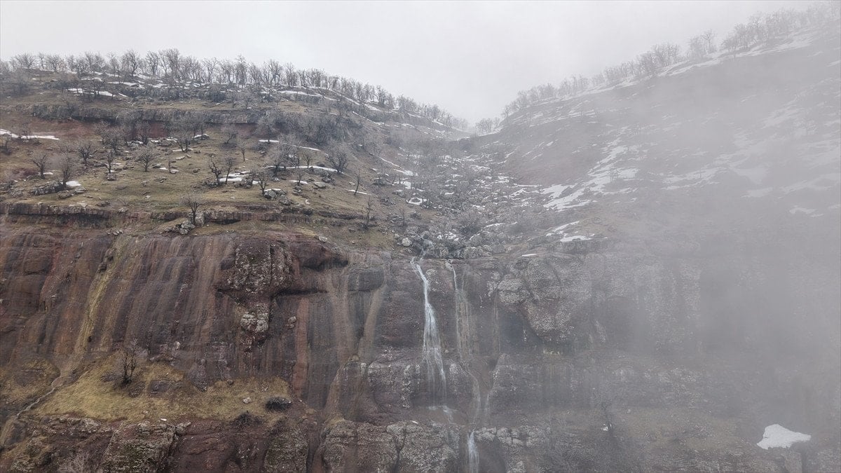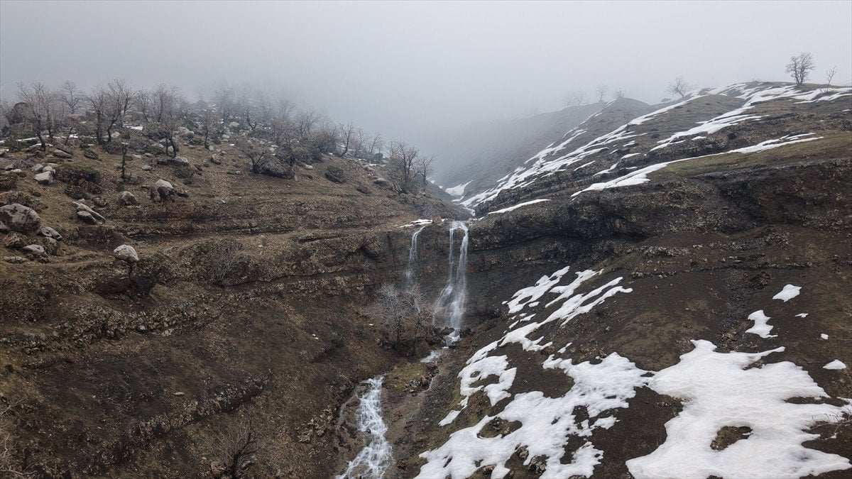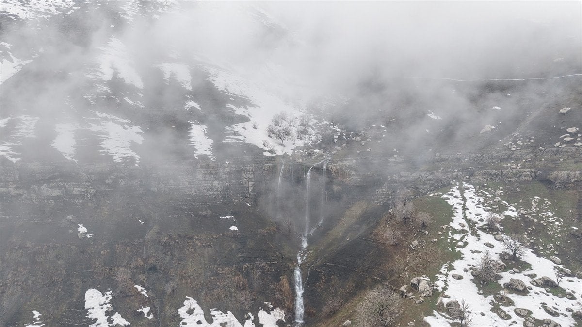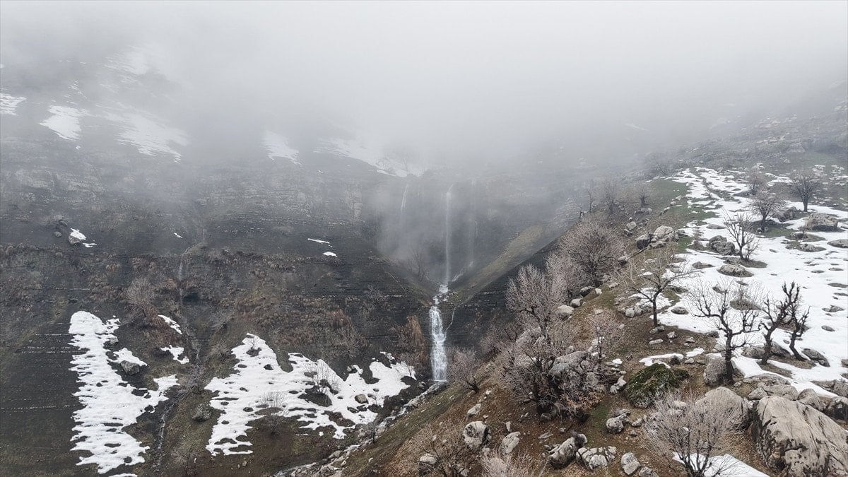 Derecik ilçesinde eriyen kar suları, Balkaya Dağları eteklerindeki şelaleleri yeniden akıttı. Sisle kaplanan yüksek kesimler ve şelaleler, drone’la görüntülendi.