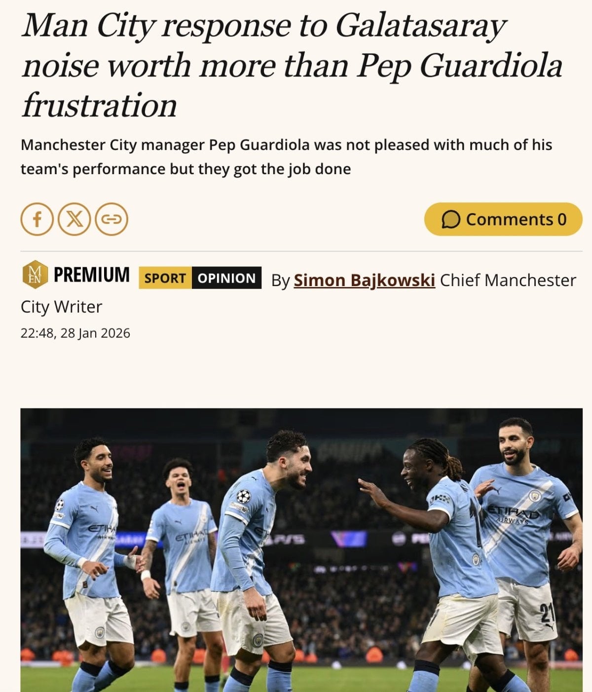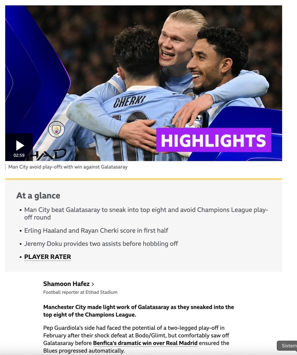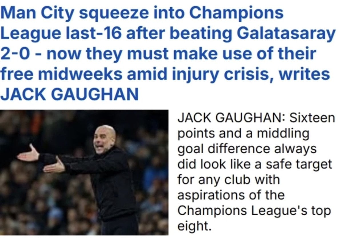 “Manchester City 2-0 Galatasaray: Doku’nun her iki golün de asistini yaptığı maçta Pep Guardiola’nın öğrencileri, Jose Mourinho’nun Benfica’sının Real Madrid’i yenmesiyle son 16’ya zar zor yükseldi. City profesyoneldi, zaferleri etkileyiciydi, ancak Galatasaray’ın etkisizliğinden de faydalandılar.”