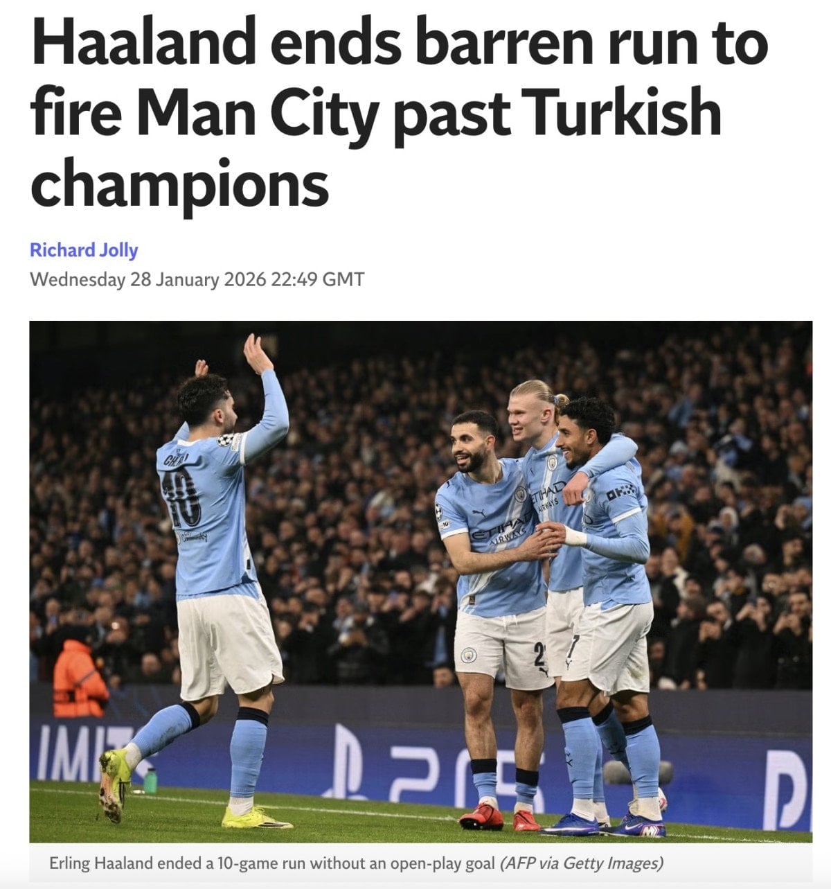 “City maçın ilk yarısında işini halletti. Haaland, yılın başından bu yana ilk kez açık oyundan gol attı ve Rayan Cherki de güzel bir organizasyonun ardından ikinci golü kaydetti. Her iki gol de, sakatlanarak oyundan çıkmak zorunda kalan etkileyici Jeremy Doku tarafından hazırlandı.”