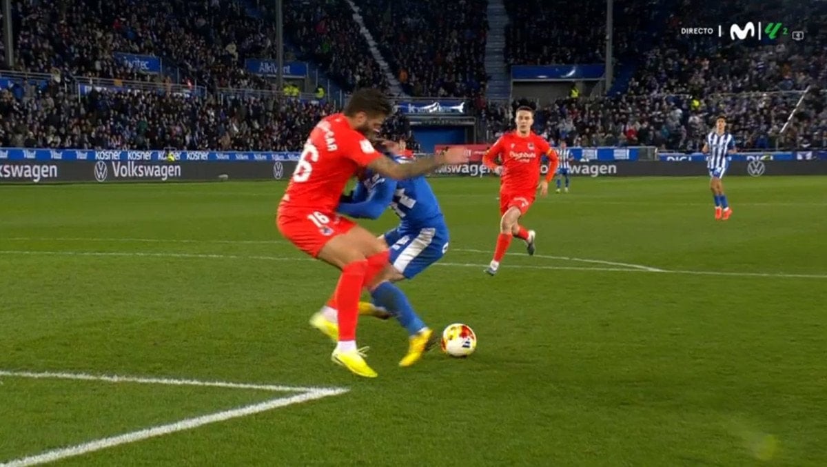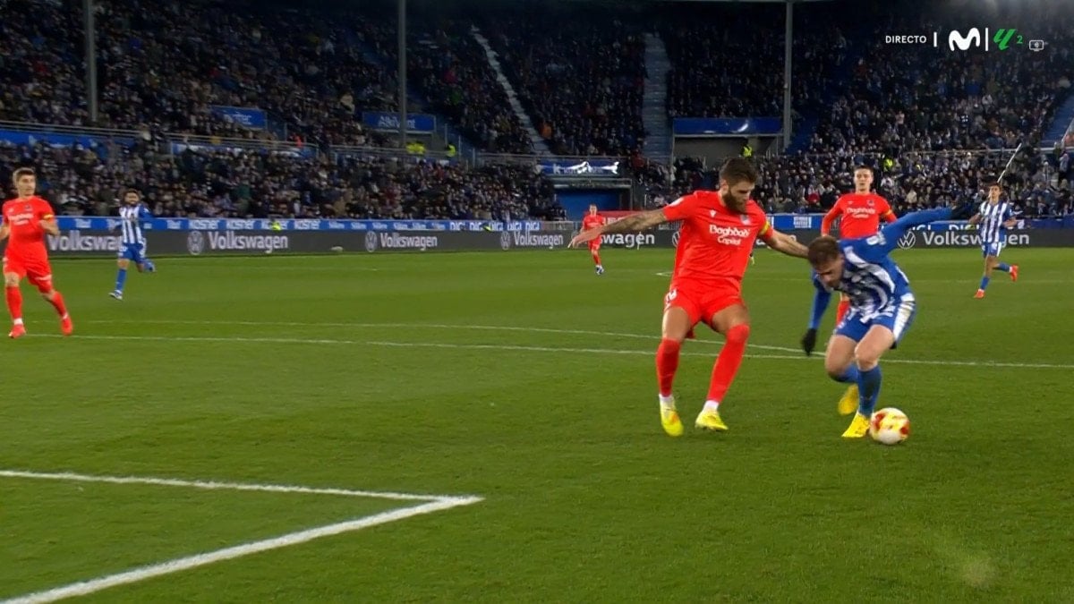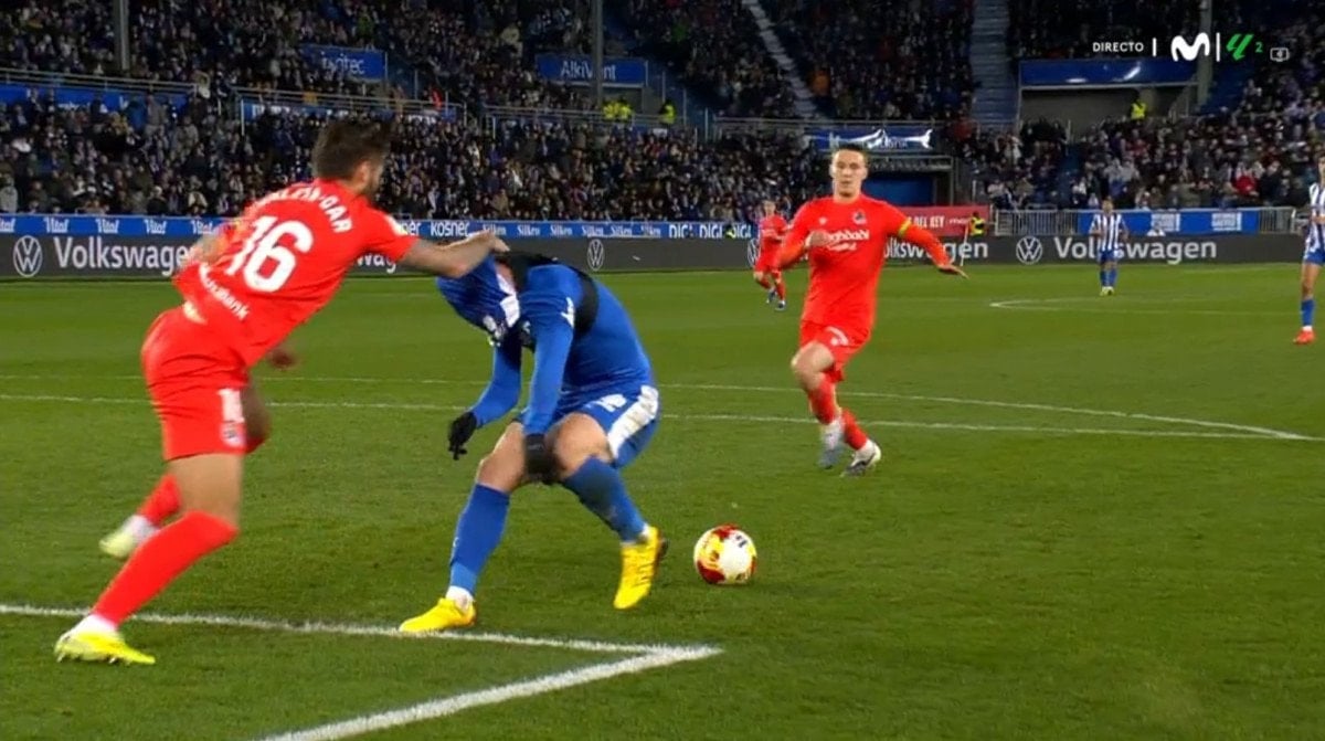 Karşılaşmanın ikinci yarısında Real Sociedad savunmacısı Duje Caleta-Car, ceza sahası içinde Alavesli Toni Martinez’in formasını çekti.