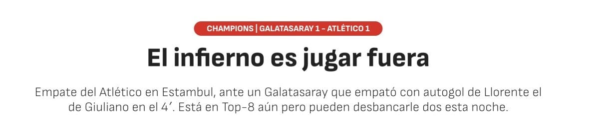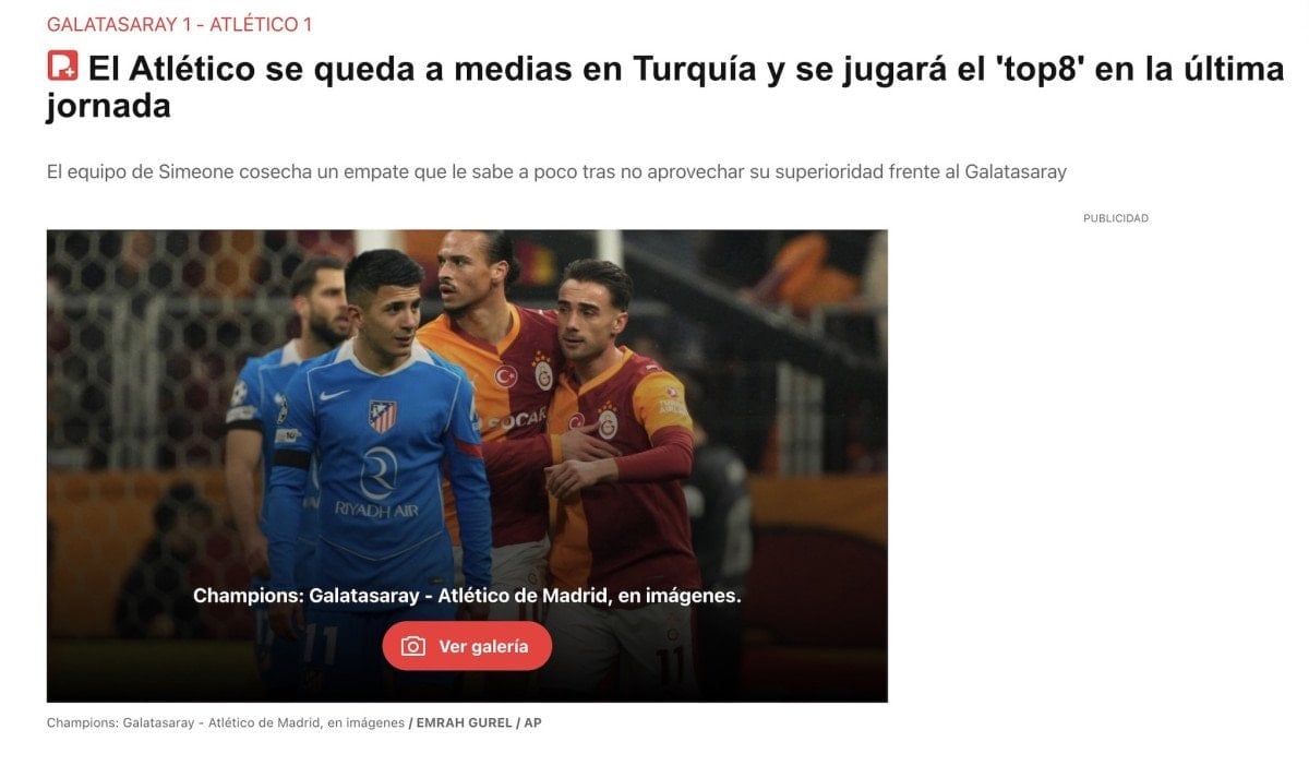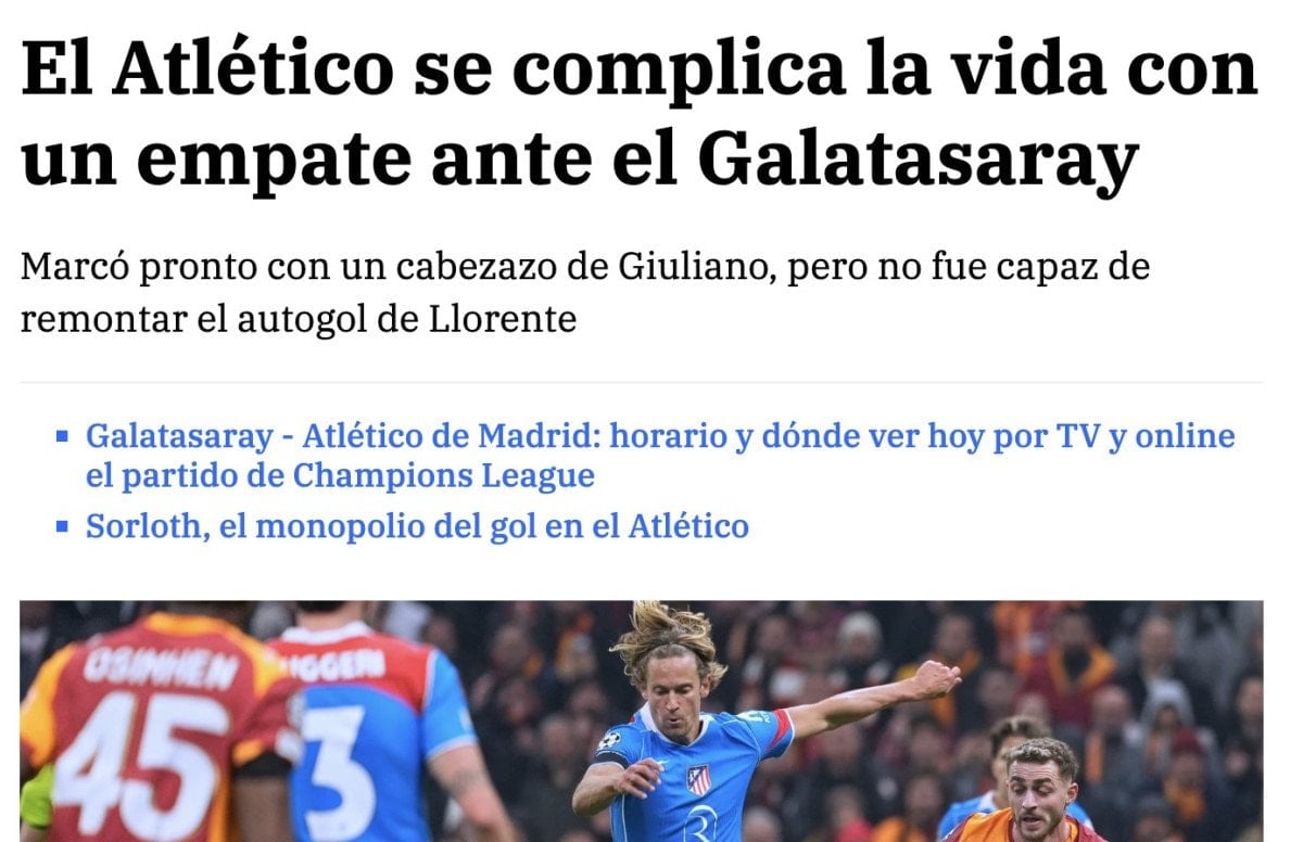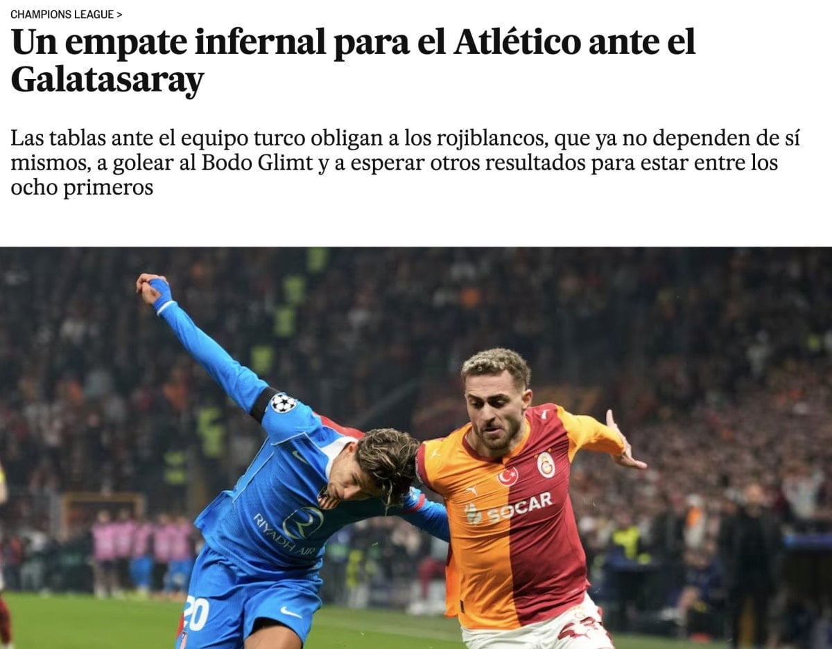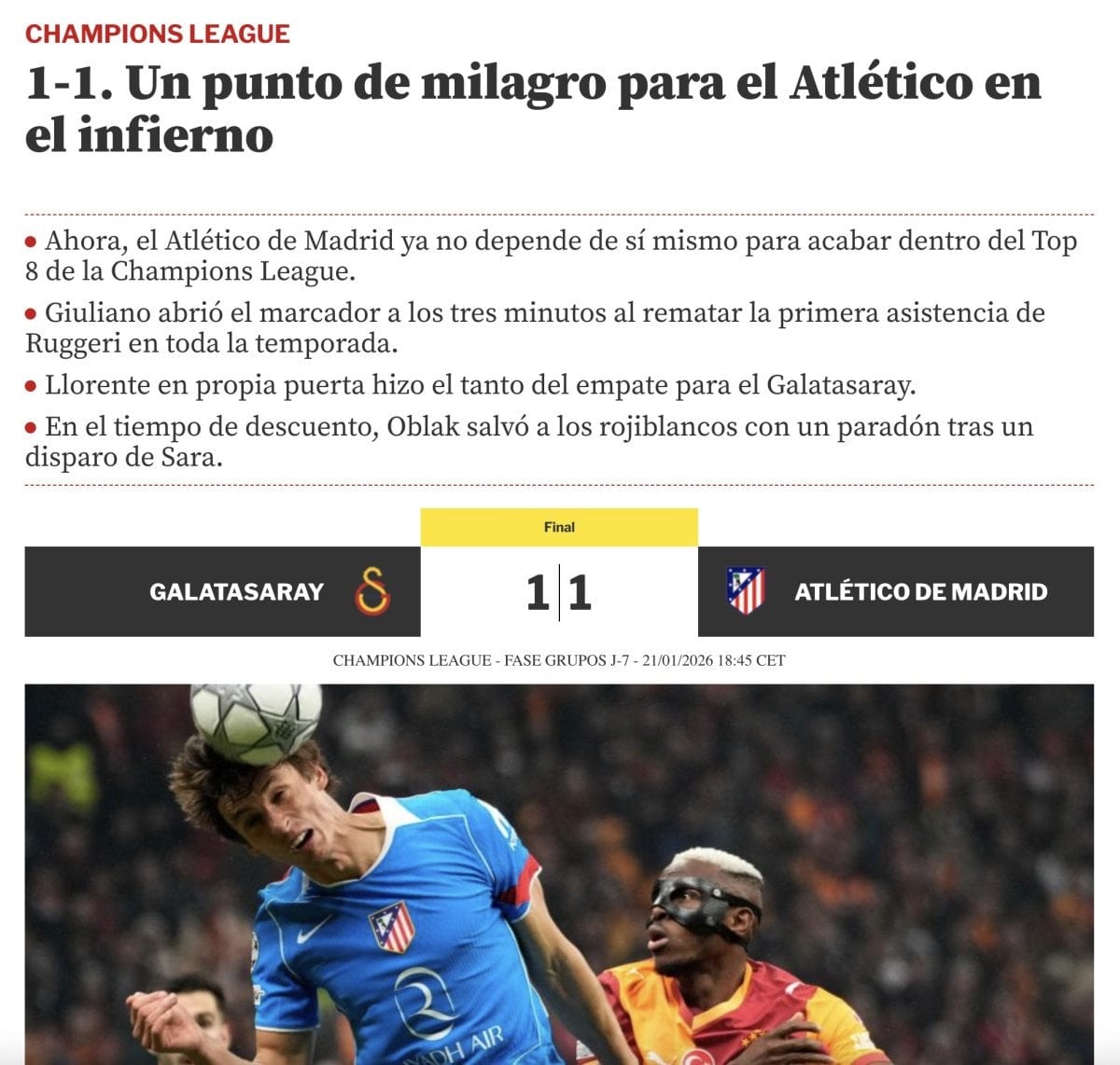“Atletico için cehennemde mucize bir puan. Artık Atlético Madrid’in Şampiyonlar Ligi’nde ilk 8’e girmek için şansı kendi performansına bağlı değil. Galatasaray, ilk dakikadan itibaren taraftarlarının desteğiyle, orta sahada savunma hattını ileriye çekerek çok yüksek bir baskı uyguladı. Son dakikalarda Galatasaray üç puanı alabilirdi, ancak Oblak her zamanki mucizesiyle Sara’nın şutunu kurtardı.”