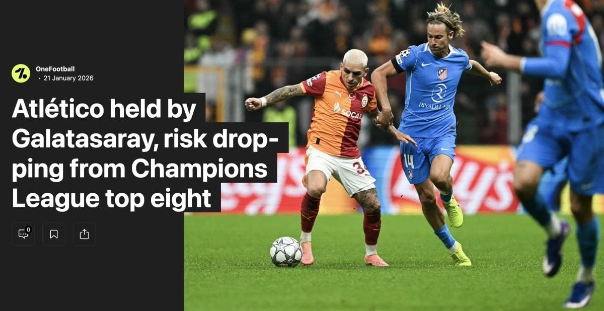 “Atletico’nun Galatasaray karşısında aldığı acı dolu beraberlik. Kırmızı-beyazlıların ilk sekize girebilmek için Bodo Glimt’i ezici bir şekilde yenmeleri ve diğer sonuçları da umut etmeleri gerektiği anlamına geliyor.”