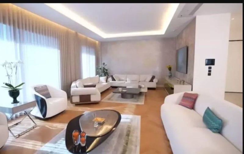 Yüksek tavanlı salonun duvarlarını tablolar ve değerli objeler süslüyor. Krem tonlarının hâkim olduğu, renkli minderlerle hareketlendirilen koltuk takımı mekâna sıcak bir hava katıyor. İki bölümden oluşan salonun bir tarafında televizyon alanı bulunurken, diğer tarafı yemyeşil bahçeye bakan geniş bir balkona açılıyor.