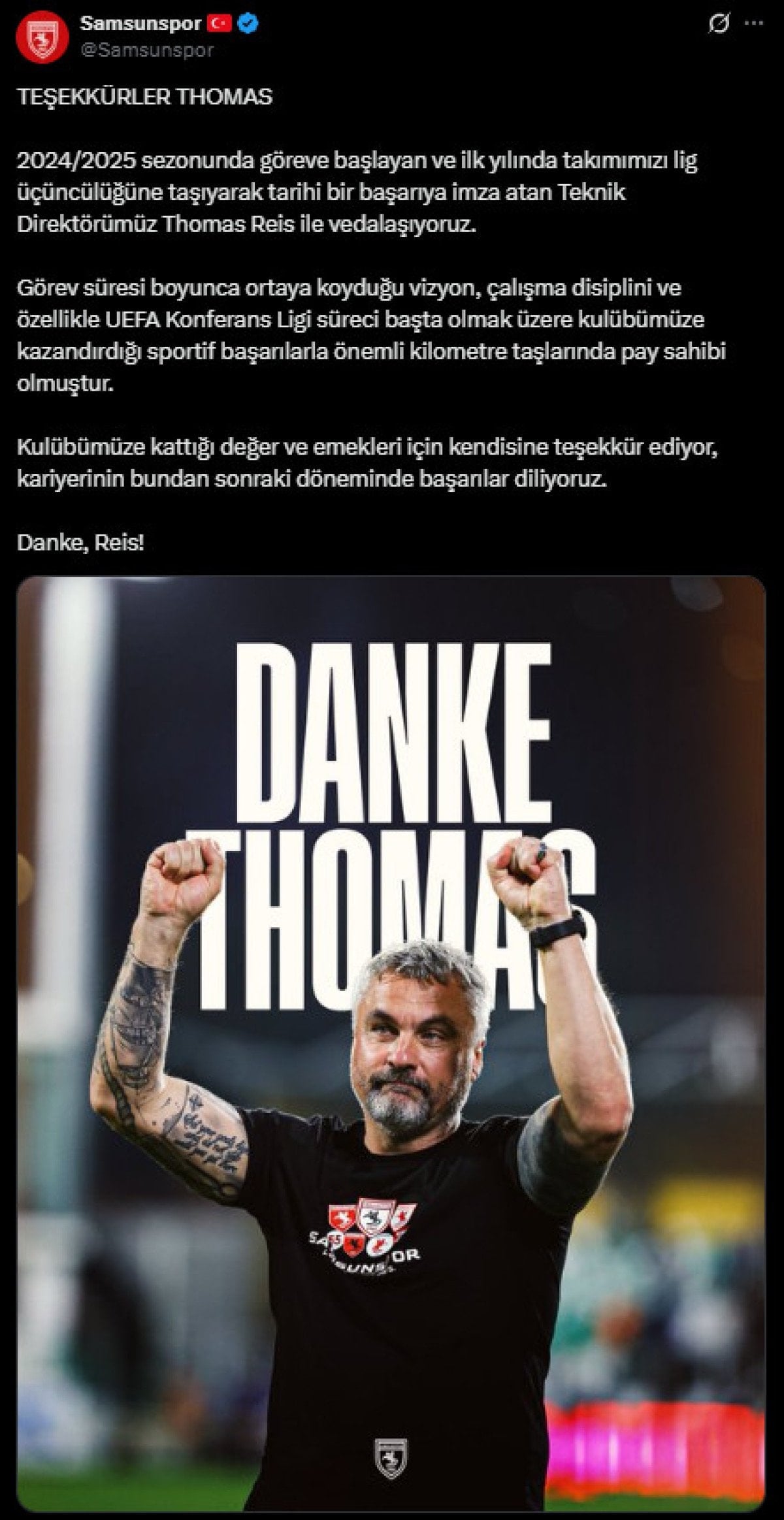 “Teşekkürler Thomas” başlığıyla yapılan paylaşımda, “2024-2025 sezonunda göreve başlayan ve ilk yılında takımımızı lig üçüncülüğüne taşıyarak tarihi bir başarıya imza atan teknik direktörümüz Thomas Reis ile vedalaşıyoruz. Görev süresi boyunca ortaya koyduğu vizyon, çalışma disiplini ve özellikle UEFA Konferans Ligi süreci başta olmak üzere kulübümüze kazandırdığı sportif başarılarla önemli kilometre taşlarında pay sahibi olmuştur. Kulübümüze kattığı değer ve emekleri için kendisine teşekkür ediyor, kariyerinin bundan sonraki döneminde başarılar diliyoruz” ifadeleri kullanıldı.