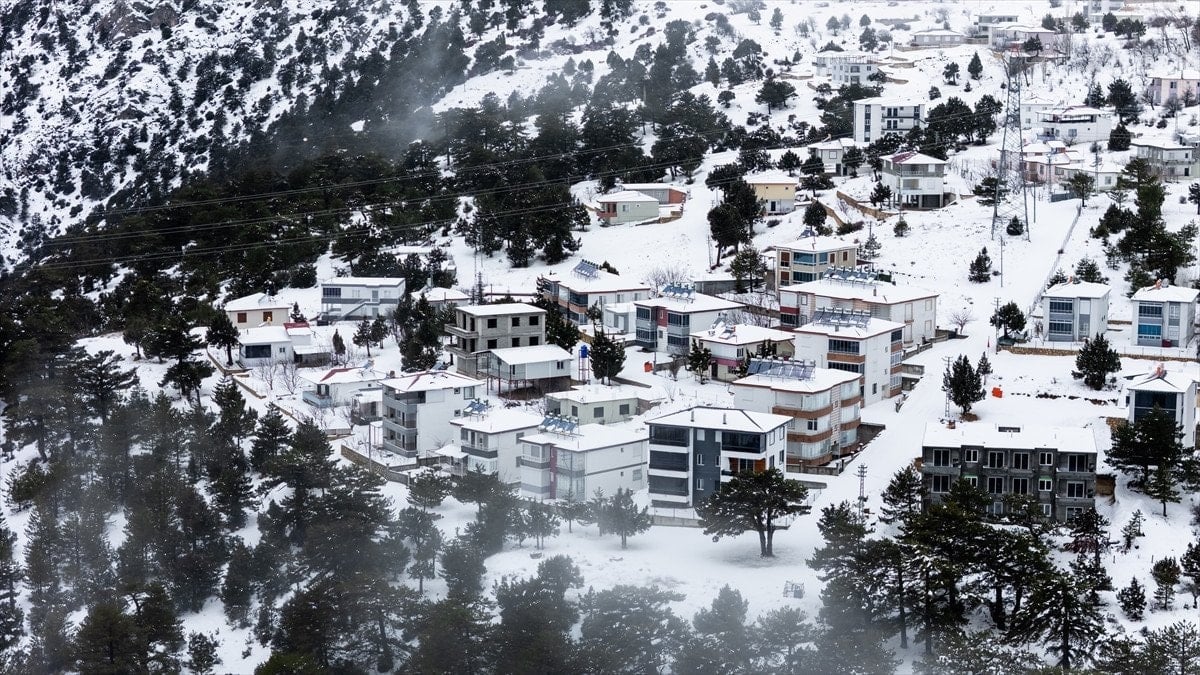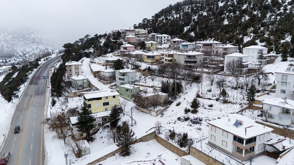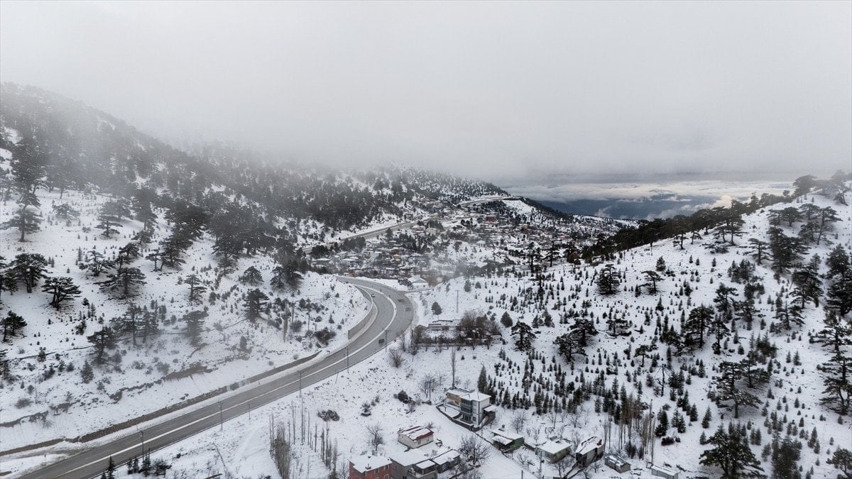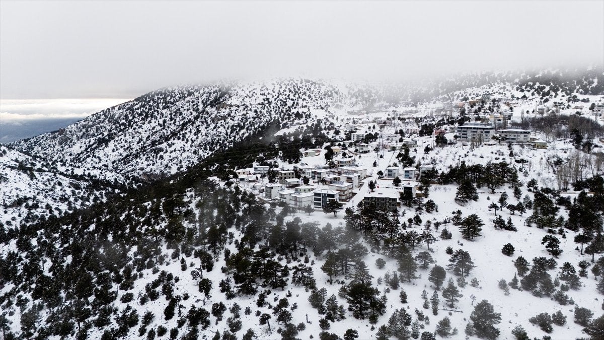 Mersin’in Mut ilçesinde etkili olan kar yağışı sonrası Sertavul Yaylası tamamen beyaz örtüyle kaplanırken, ortaya çıkan kış manzarası dronla kayda alındı.