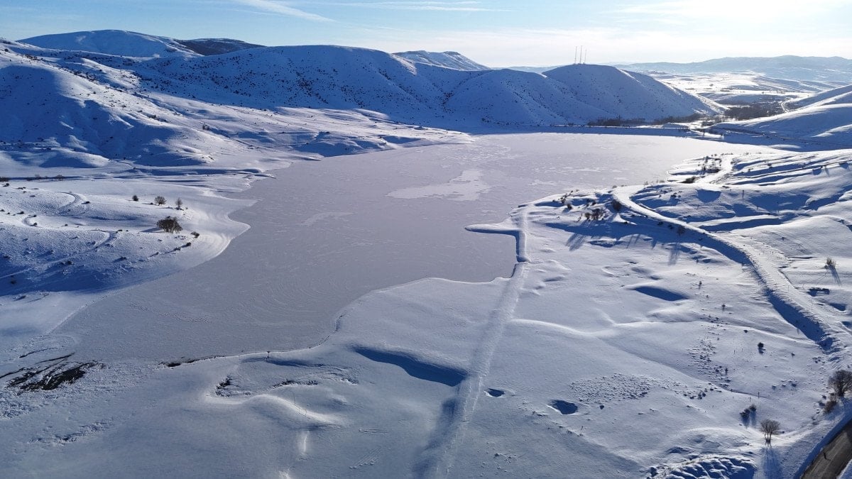 Kent merkezine yaklaşık 50 kilometre uzaklıkta, 2 bin 552 metre rakıma sahip Yıldız Dağı’nın güney yamacında bulunan gölet, çevresini saran dağ silsilesiyle birlikte görsel bir şölen sundu. Donan gölet, bölgenin sert kış koşullarını bir kez daha gözler önüne serdi.