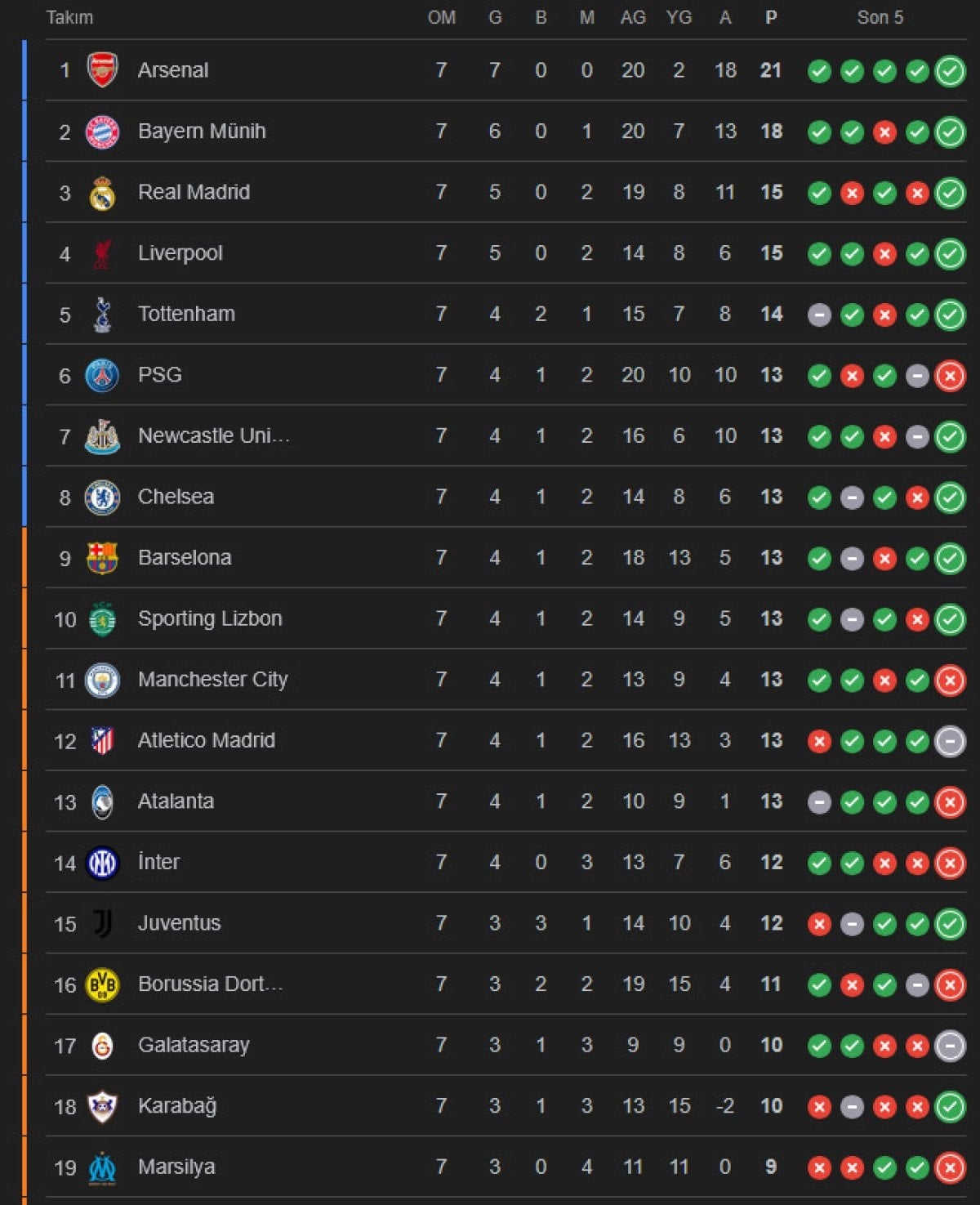 Son müsabakalar öncesi 15’er puanlı Real Madrid ve Liverpool ile 14 puana sahip Tottenham, ilk 16 sıra içerisinde yer almayı garantiledi.