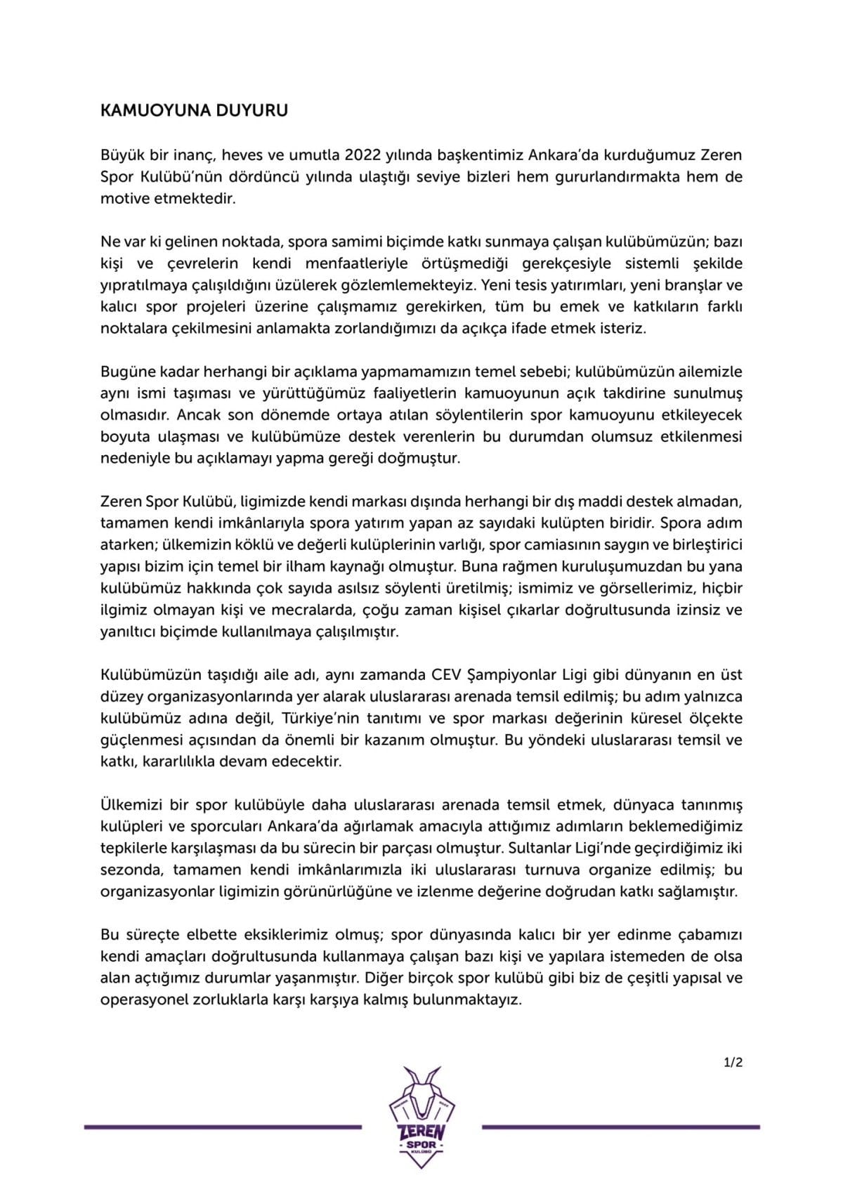 Ankara temsilcisinin açıklamasında CEV Şampiyonlar Ligi’nin isim sponsorluğuna dair ise “Kulübümüzün taşıdığı aile adı, aynı zamanda CEV Şampiyonlar Ligi gibi dünyanın en üst düzey organizasyonlarında yer alarak uluslararası arenada temsil edilmiş bu adım yalnızca kulübümüz adına değil, Türkiye’nin tanıtımı ve spor markası değerinin küresel ölçekte güçlenmesi açısından da önemli bir kazanım olmuştur. Bu yöndeki uluslararası temsil ve katkı, kararlılıkla devam edecektir.” ifadeleri kullanıldı.