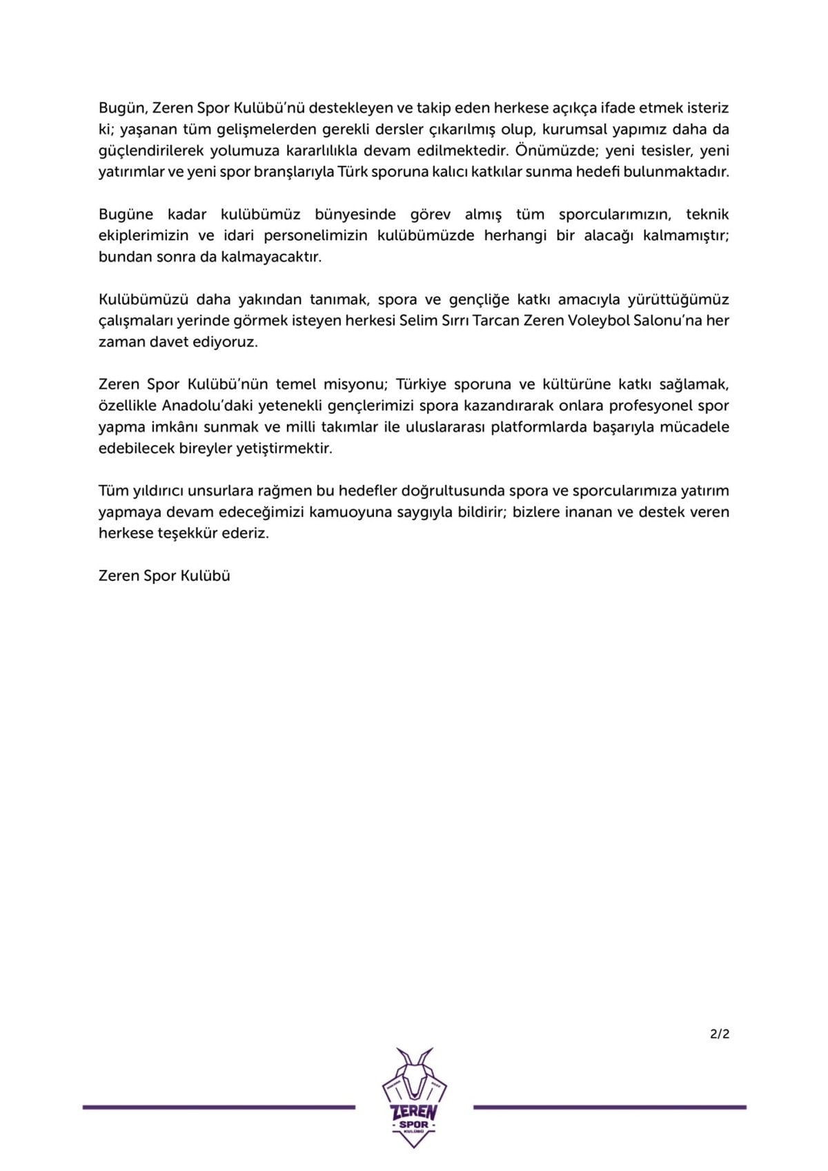 Zeren Spor Voleybol Kulübü, “Bugüne kadar kulübümüz bünyesinde görev almış tüm sporcularımızın, teknik ekiplerimizin ve idari personelimizin kulübümüzde herhangi bir alacağı kalmamıştır, bundan sonra da kalmayacaktır” açıklamasını yaptı.